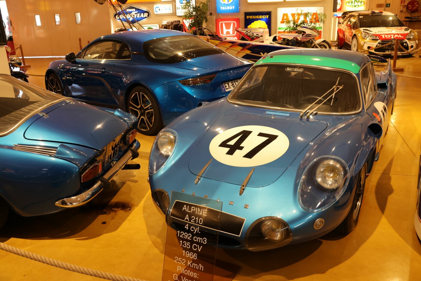 Arrêtons-nous devant cette A210 210. Cette auto rappelle que Jean Rédélé est un grand créateur qui savait bien s’entourer, Richard Bouleau pour le châssis, Marcel Hubert pour l’aéro. Celle-ci est une voiture extraordinaire, quand tu montes dedans, que tu t’assieds au milieu des tubes du châssis tu ressens une émotion sans égal. Elle a le moteur Gordini, le vrai double arbre, celui de 1300 cm3 et 135 ch. L’exploit est qu’avec cette petite cylindrée et cette puissance modeste, elle atteignait plus de 250 km/h . Elle a une surface frontale réduite, une aérodynamique d’une finesse incroyable. J’ai eu la chance de la piloter souvent, elle a encore la boite du Mans, c’est dire une première très longue, c’est une voiture merveilleuse.
