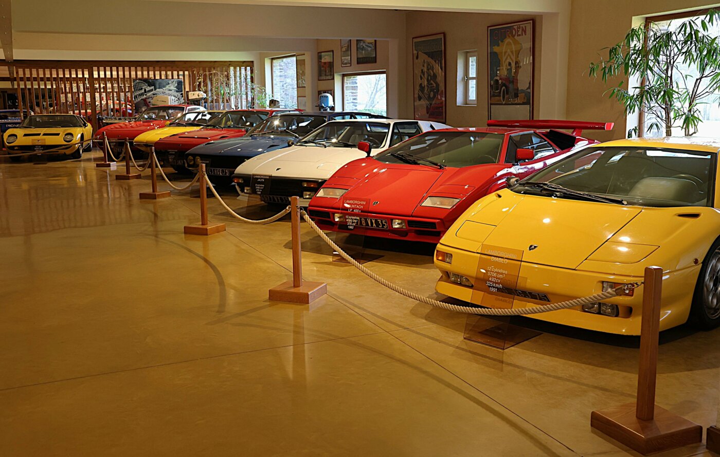 Michel Hommell a le chic de présenter des gammes quasiment complètes, ici dans l’espace Lamborghini, nous sommes devant cette Diablo, elle a une histoire, c’est celle qui était sur le stand au Salon de Paris 1991, à la fermeture, on l’a sortie du stand et le lendemain on l’a ramenée ici au Manoir, Michel à son volant. A côté la Countach que j’aime beaucoup, remarquez le capot avant et le pare-brise sont dans l’exact prolongement, sublime. La Diablo elle a une remarquable répartition des masses, le moteur est longitudinal central et la boite dans l’habitacle, c’est aussi dur à manipuler que devait l’être la boite de la Cooper Maserati du père Ligier. La Miura, c’est tellement banal de la vanter que je ne vais pas le faire, seulement rappeler que c’est celle qui a donné des sueurs froides à Ferrari, c’est le meilleur hommage que l’on puisse faire.