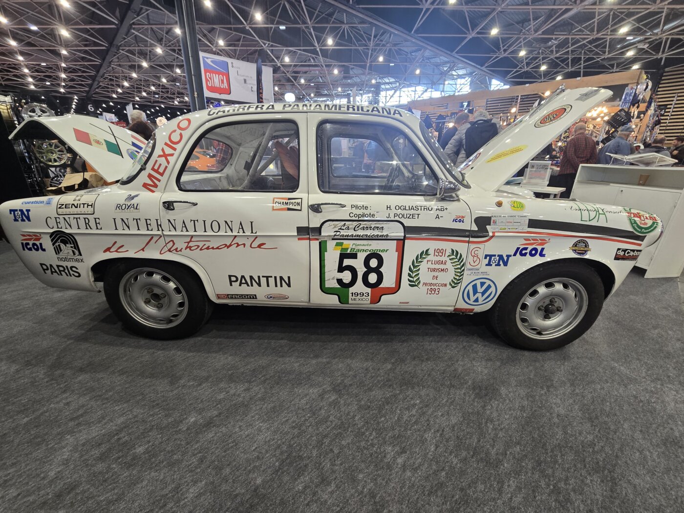 Hervé Ogliastro auquel on doit d’une part le Centre International de l’Automobile ( CIA à Pantin) et d’autre part le livre qui vient d’en narrer l’odyssée, illustrait cette dernière avec une de ses anciennes voitures. Il s’agit d’une Alfa Romeo Giulia 1900 très préparée avec laquelle il a fait la Carrera Panamericana à plusieurs reprises et avec panache. En effet, il s’est imposé deux fois en catégorie tourisme, en 1991 et en 1993 tout en se classant 9e puis 5e au général. Performance plus que respectable tant la course mexicaine est compétitive. Les observateurs avertis pourront constater la position très abaissée du moteur et le pense-bête inscrit sous le capot moteur concernant l’entretien obligatoire le soir à l’étape. Vitres en plexi, allégée de tous côtés, réservoir FIA, cette auto, comme le dit Hervé Ogliastro est un vai proto !