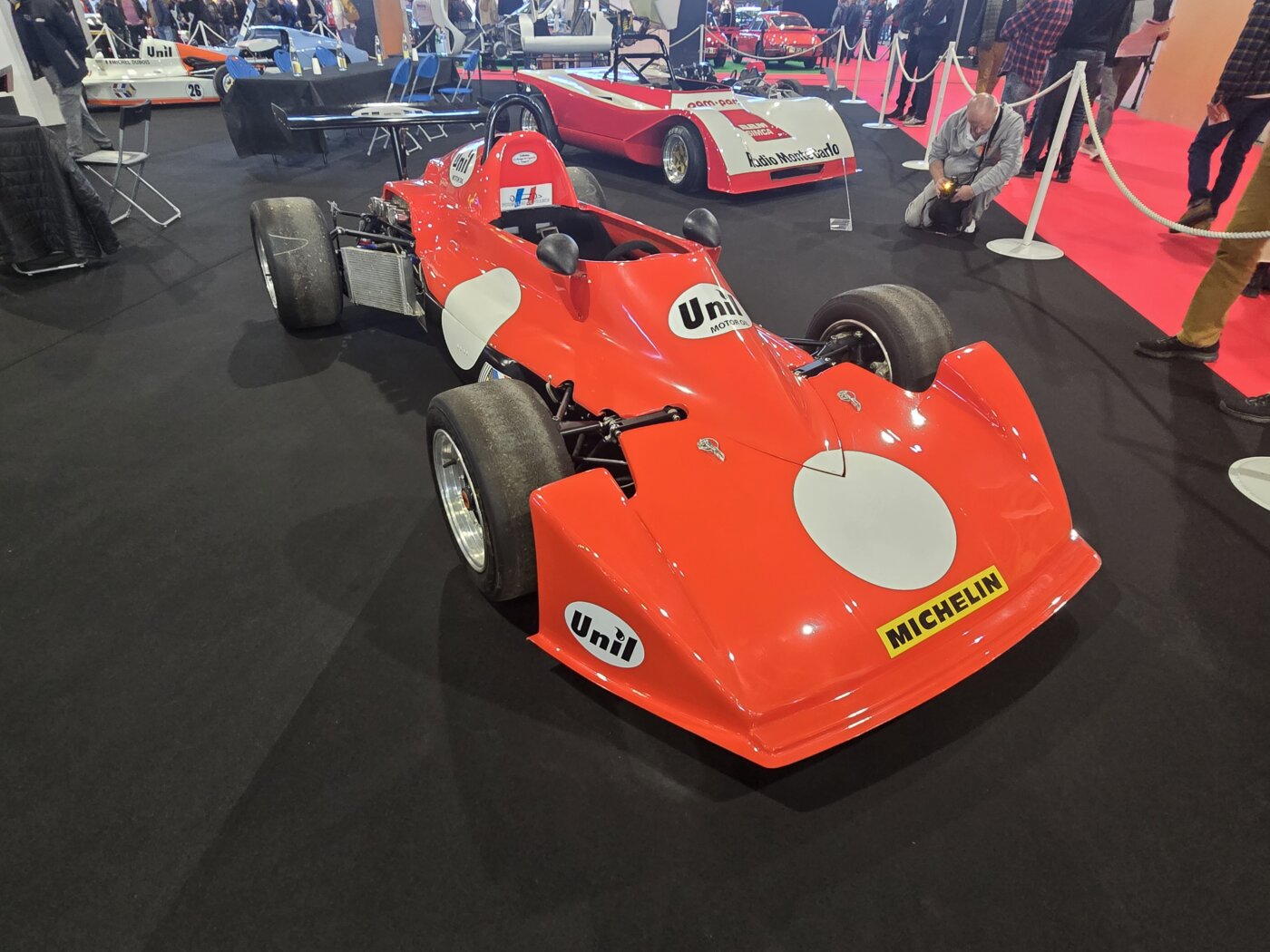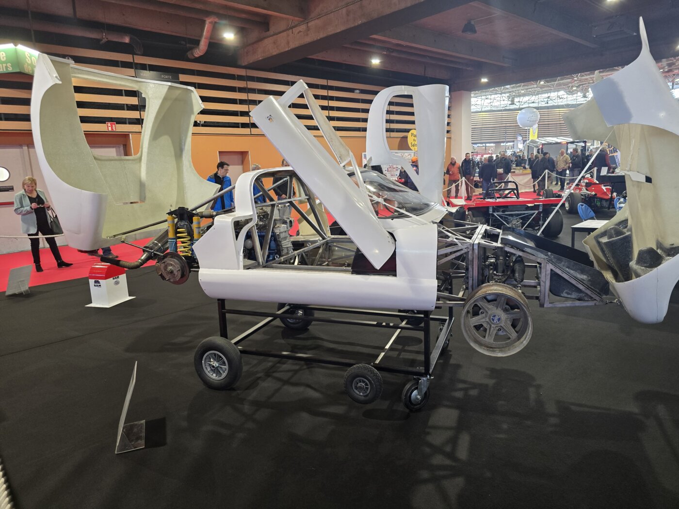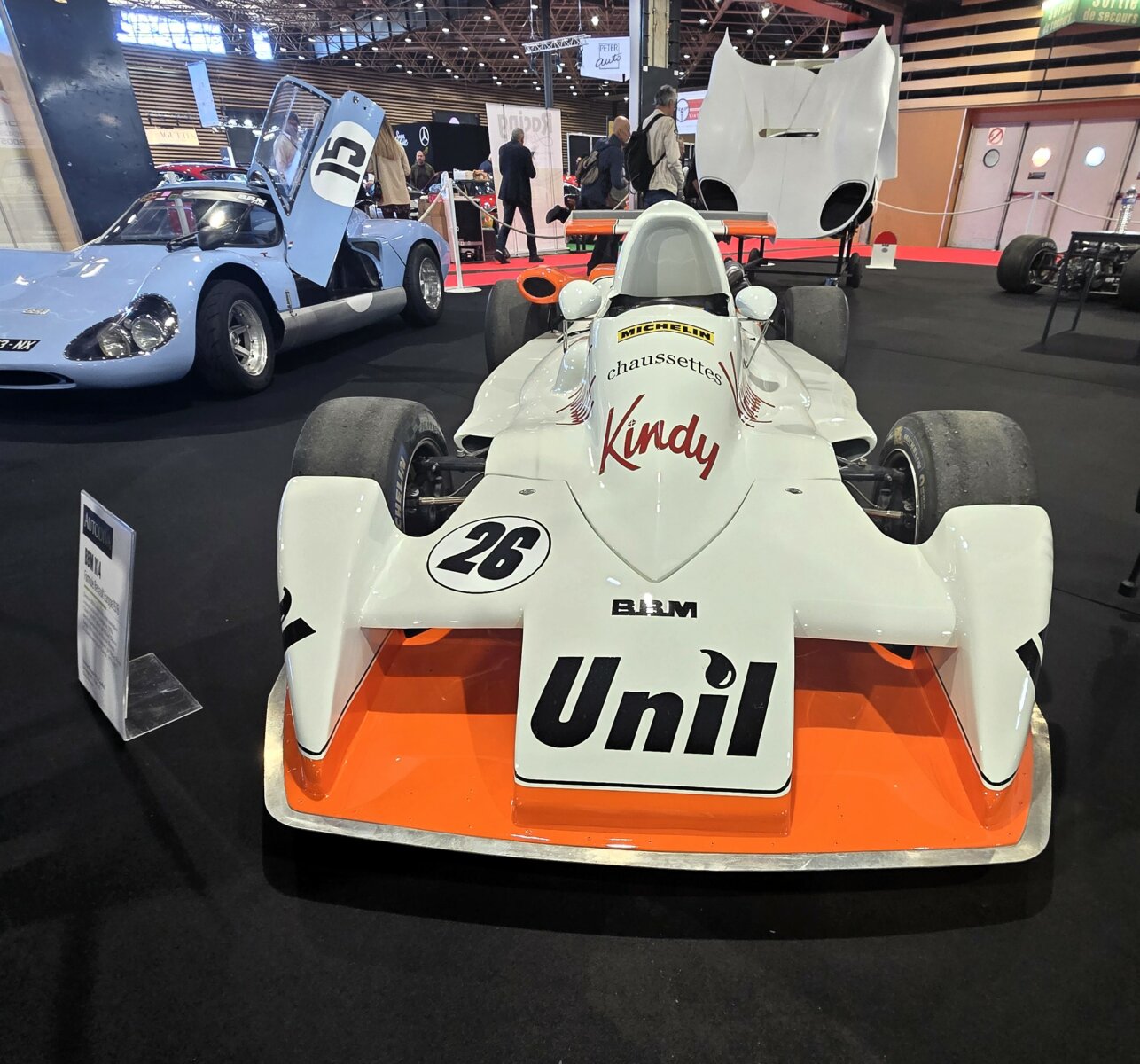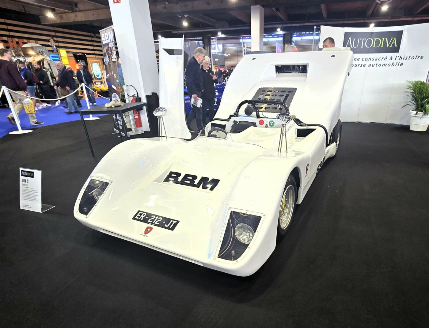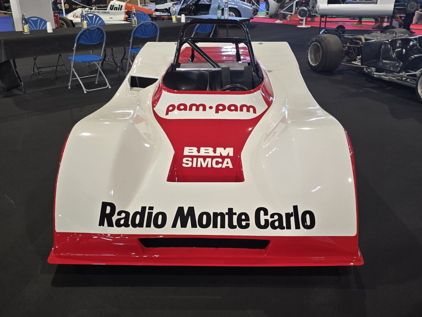 Gérard Gamand nous a gratifié d’une nouvelle exposition intéressante avec BBM. Comme Bertin Boussu Mercier qui ont produit 50 autos entre 1969 et 1976. Installé près d’Amiens, Pierre Bertin Boussu dessinait ses voitures. Jean-Michel Mercier les concevaient. Elles ont remporté le Challenge Simca en 1972 et la Coupe Simca Shell en 1974. Bien finies et esthétiques, elles impressionnent toujours aujourd’hui. La C1 à moteur Lamborghini nous laisse très désireux de l’entendre tourner ! Quant à la voiture reconstruite de Guy Dhotel ( Il était présent,malheureusement nous n’avons pas réussi à le croiser), elle est à la fois belle et sombre. Reconstruite après l’accident qui privera définitivement son pilote de compétition… (Guy Dhotel)