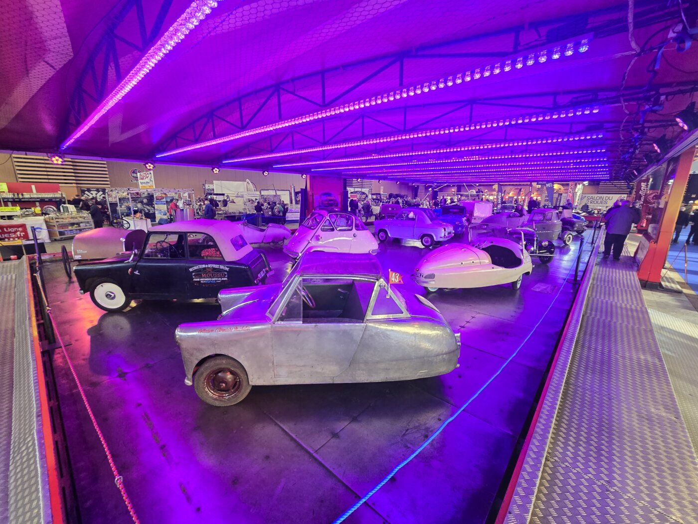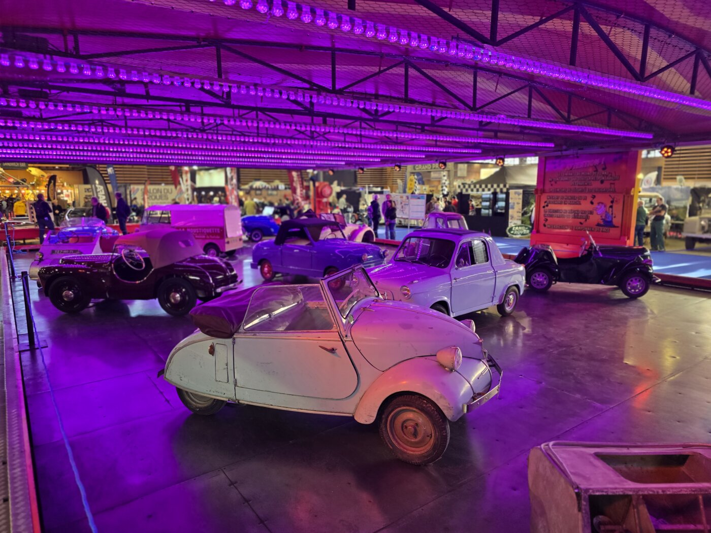 Un charmant manège d’autos tamponneuses empli de microcars. Hybrides moto-autos qui ont donné aux européens un moyen de déplacement dans les années 50 et 60. Il manquait peut être une Messerschmidt ?