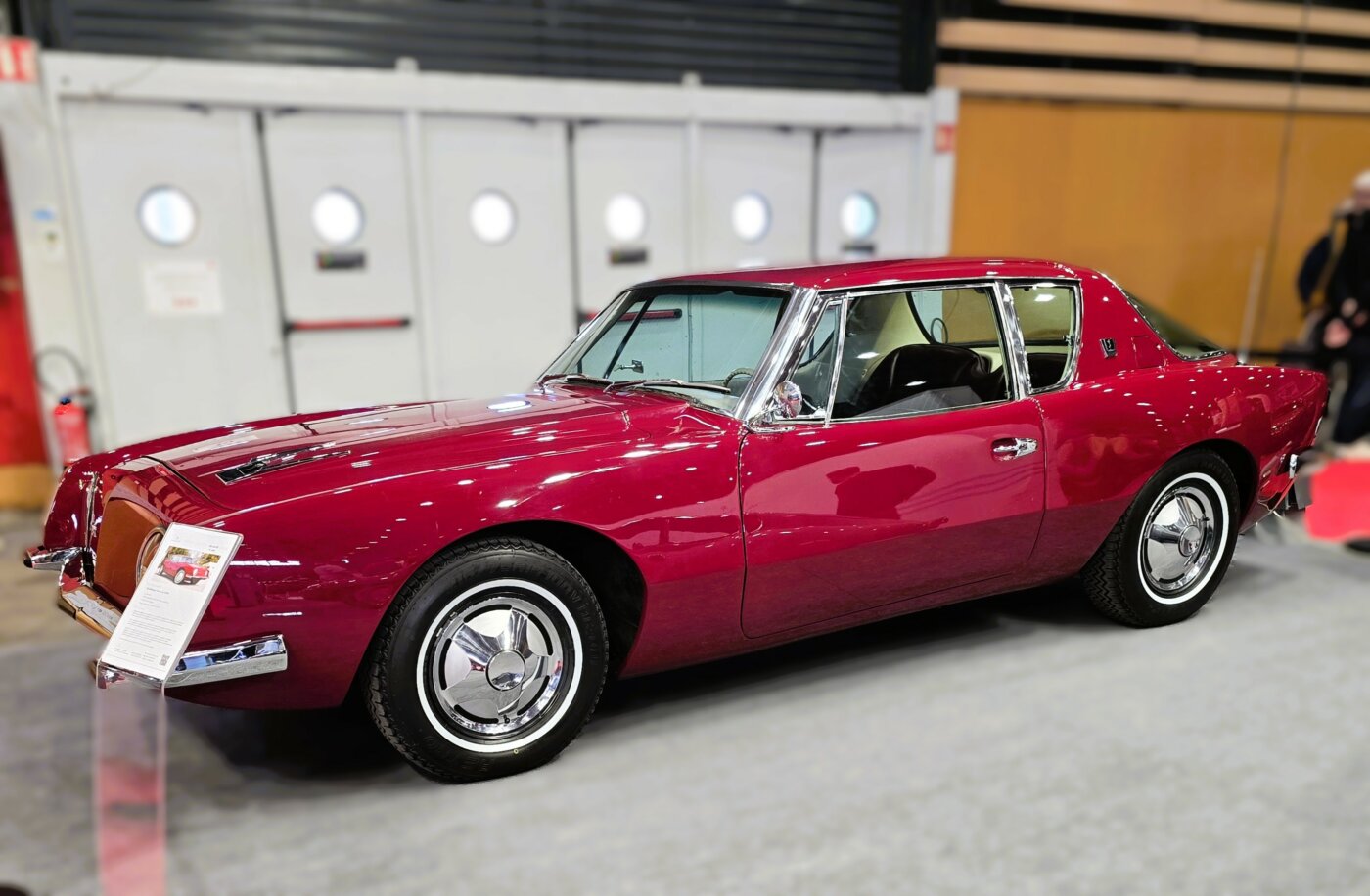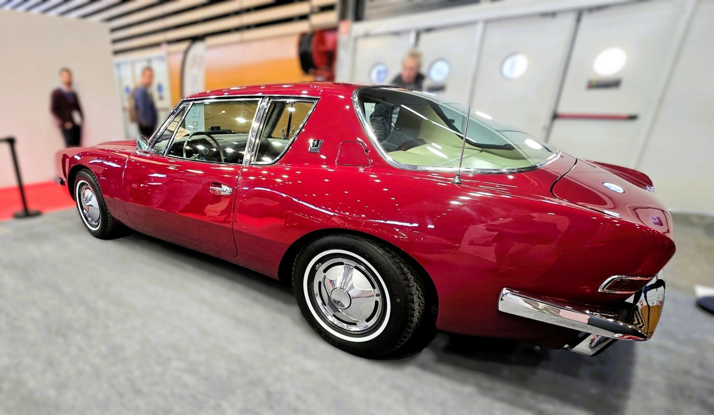 Son dessin par Raymond Loewy, net et propre à une époque ou le chrome dégoulinait encore beaucoup sur toutes les carrosseries US. Carrosserie en fibres de verre et moteur Studebaker V8 289. Cette auto se démarquait. Et se démarque toujours. Elle évoque un équivalent US de la Citroën SM. Aucune des deux n’atteindra son objectif : sauver la marque Studebaker pour la première, faire conserver son rang avant gardiste à Citroën pour l’autre. Cet exemplaire semblait en état neuf, entièrement restauré.