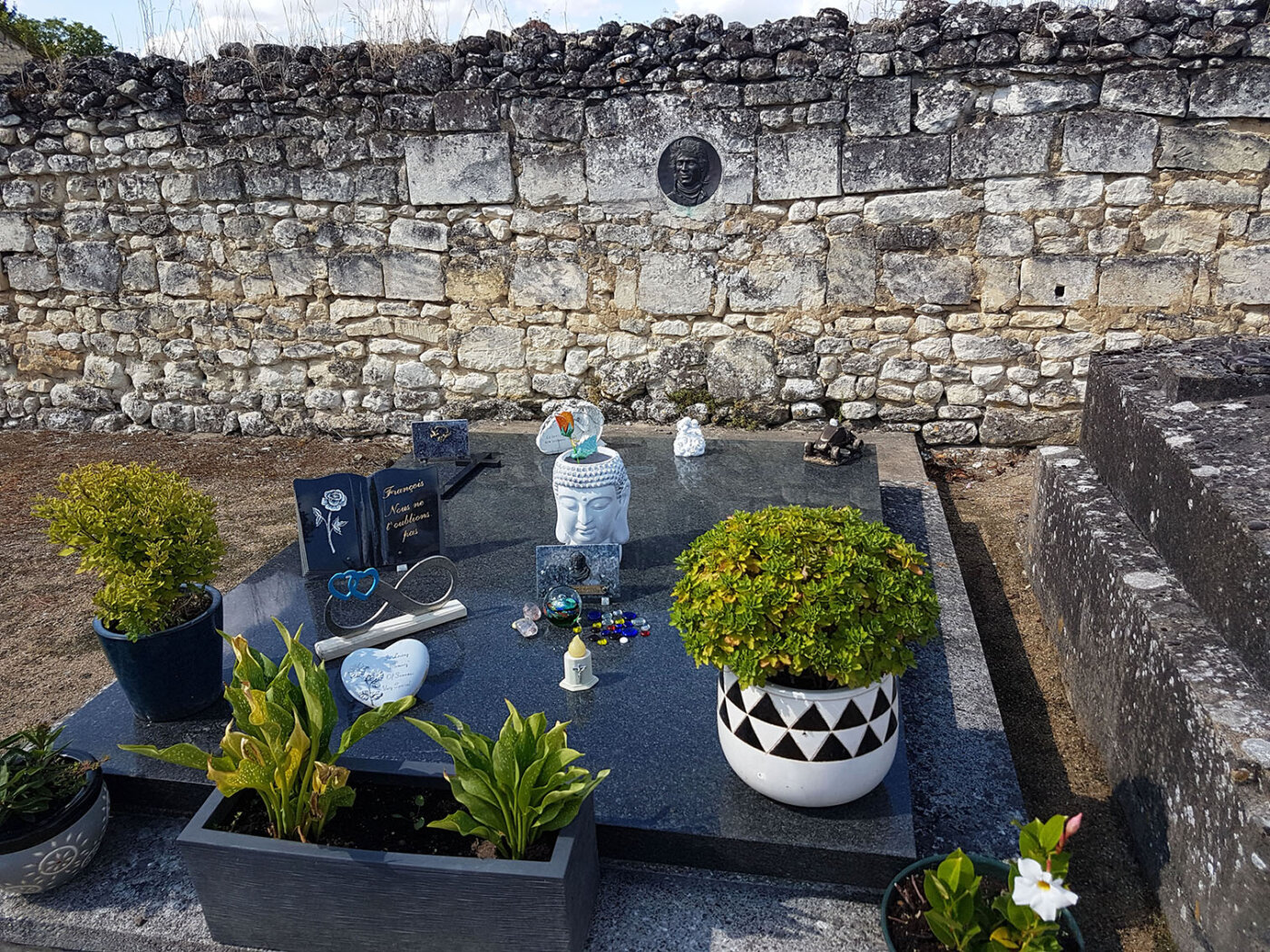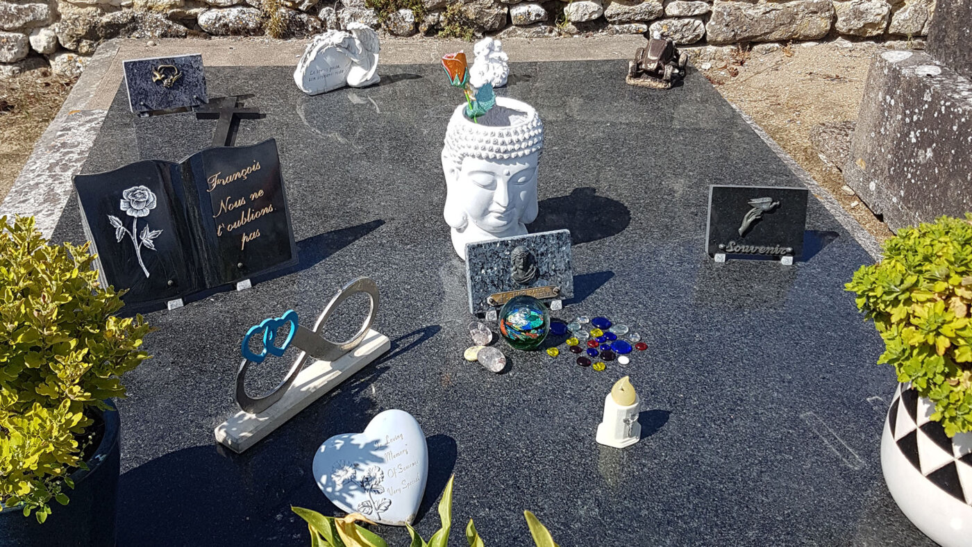 La plaque de marbre noir est assez sobre, surmontée par quelques inévitables objets de ce qu’on appelle « art funéraire », appelant au souvenir éternel. Des plantes en pot décorent simplement l’espace, tout est parfaitement soigné et taillé : ceux qui reposent là ne sont d’évidence pas oubliés.