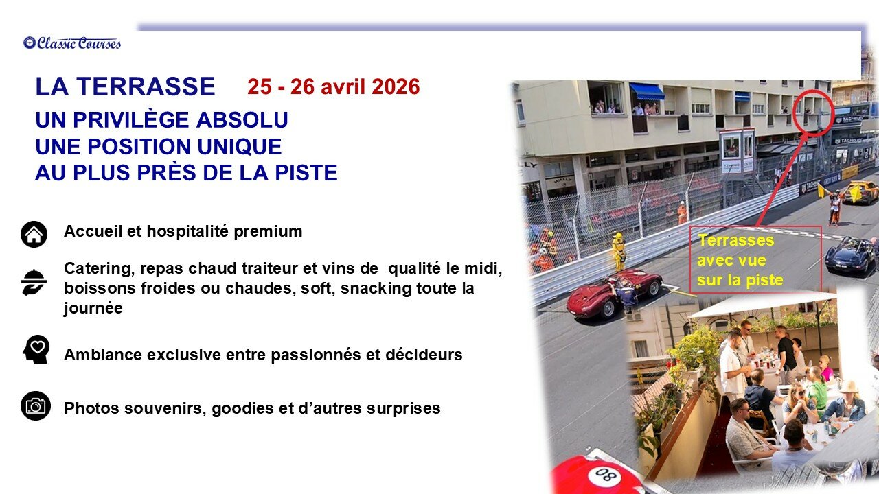 Assister au Grand Prix de Monaco Historique 2026 depuis une terrasse située sur la ligne de départ, face à la sortie des stands. C’est ce que nous vous proposons.